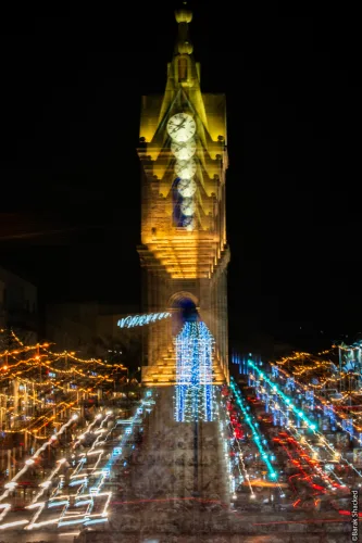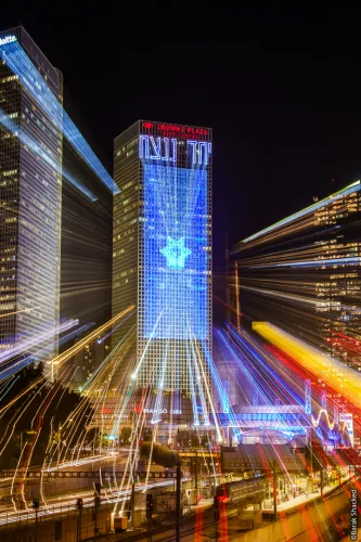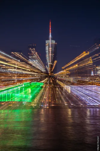חפשו אורות נקודתיים, מבנה סימטרי, מגדל או סצנה עם מרכז ברור.